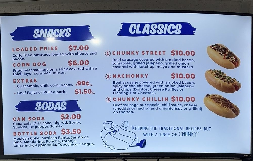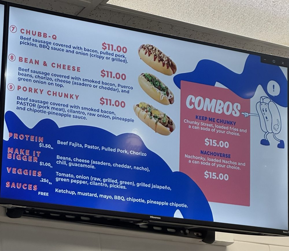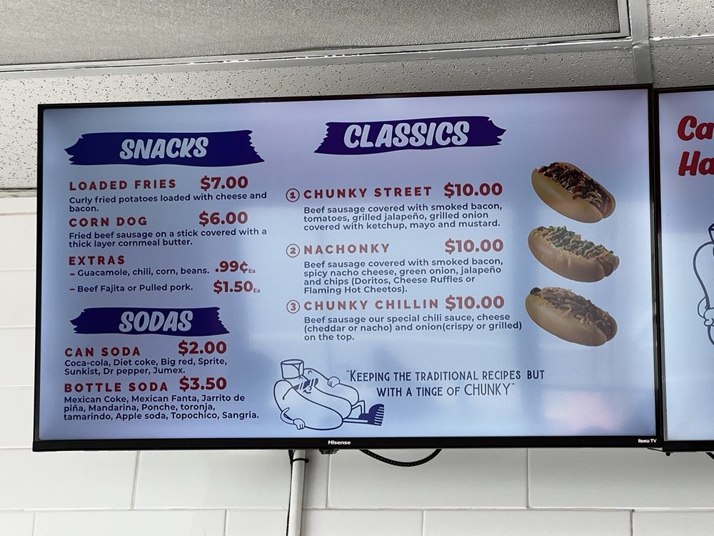 Introducing El Chunky, a hotspot in San Antonio, Texas, known for its mouth-watering variety of 9-inch hot dogs and flavorful snacks. The menu offers unique creations like the Chunky Street with bacon-wrapped beef sausage, jalapeƱos, and a medley of sauces, or the Chiponky with sweet corn and chipotle cream. Customers rave about the loaded fries and Mexican-inspired dishes like the corn in a cup. The cozy setting with limited seating adds to the charm, while quick service and friendly staff enhance the overall experience. From the diverse menu to the welcoming atmosphere, El Chunky is a must-visit for food enthusiasts seeking a taste of Latinx-owned culinary delights.